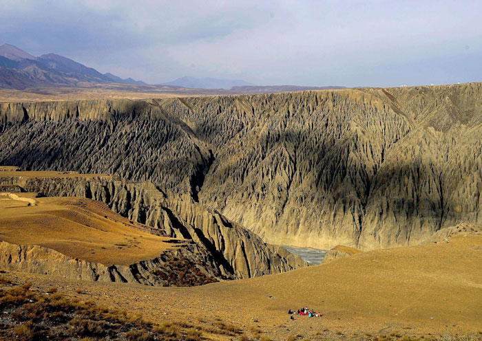 站在觀景臺,往下俯看,只見溝壑縱橫交錯的大峽谷,猶如突然在一大片平地上,撕開了的一條巨大裂縫,長約20公里,穀底寬100~400米,穀肩寬800~1000米,從穀底到穀肩高可達200米。懸壁兩旁,經千年天山雪水、雨水流下沖積的溝壑,排列整齊、層次分明,鬼斧神工,栩栩如生,如在此埋伏了十萬兵馬,無不為大自然的神奇折服。